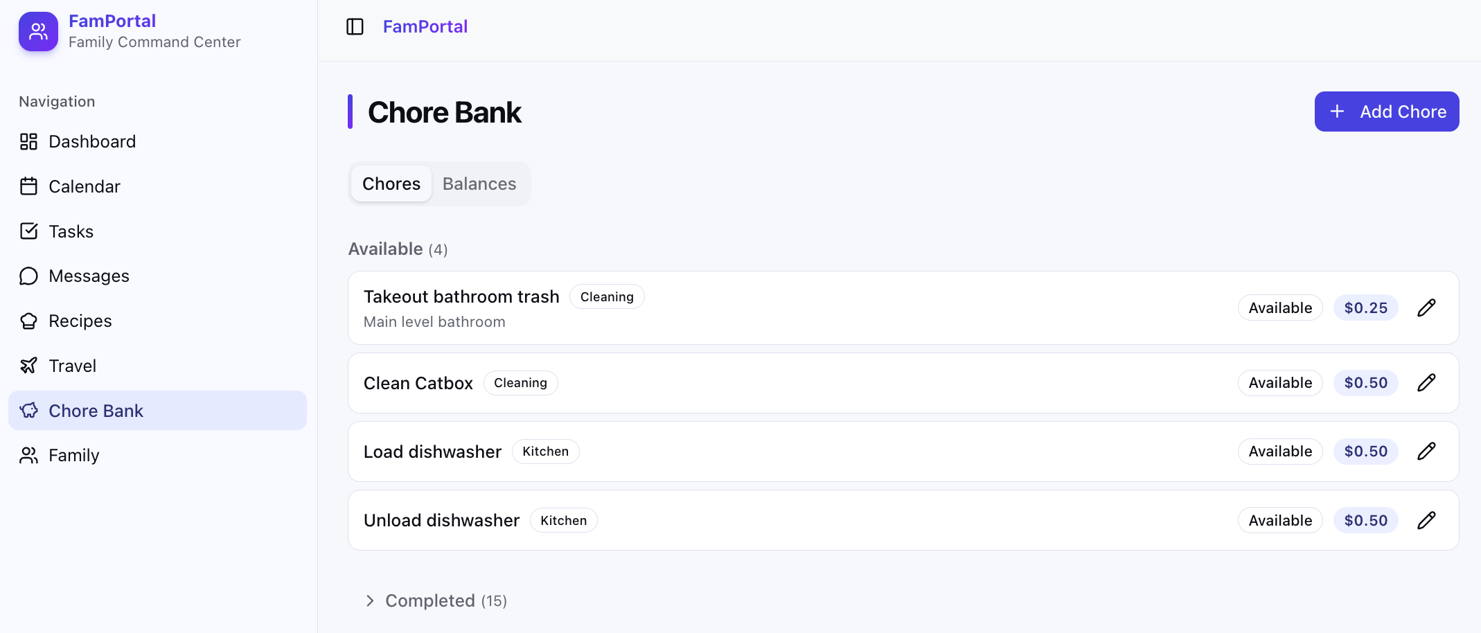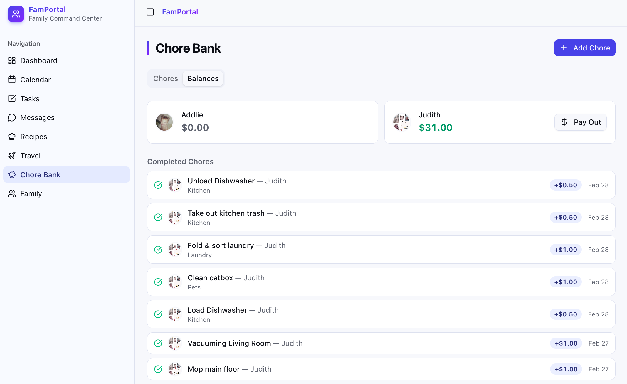 Family members can claim a chore, and mark it as completed when they are done. Then, the owner user (myself) has to approve that it's been completed. Once approved, this adds the dollar amount to the family member's balance: